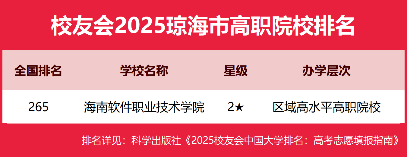 | 校友会2025琼海市大学排名 ,海南软件职业技术学院第一 | |||