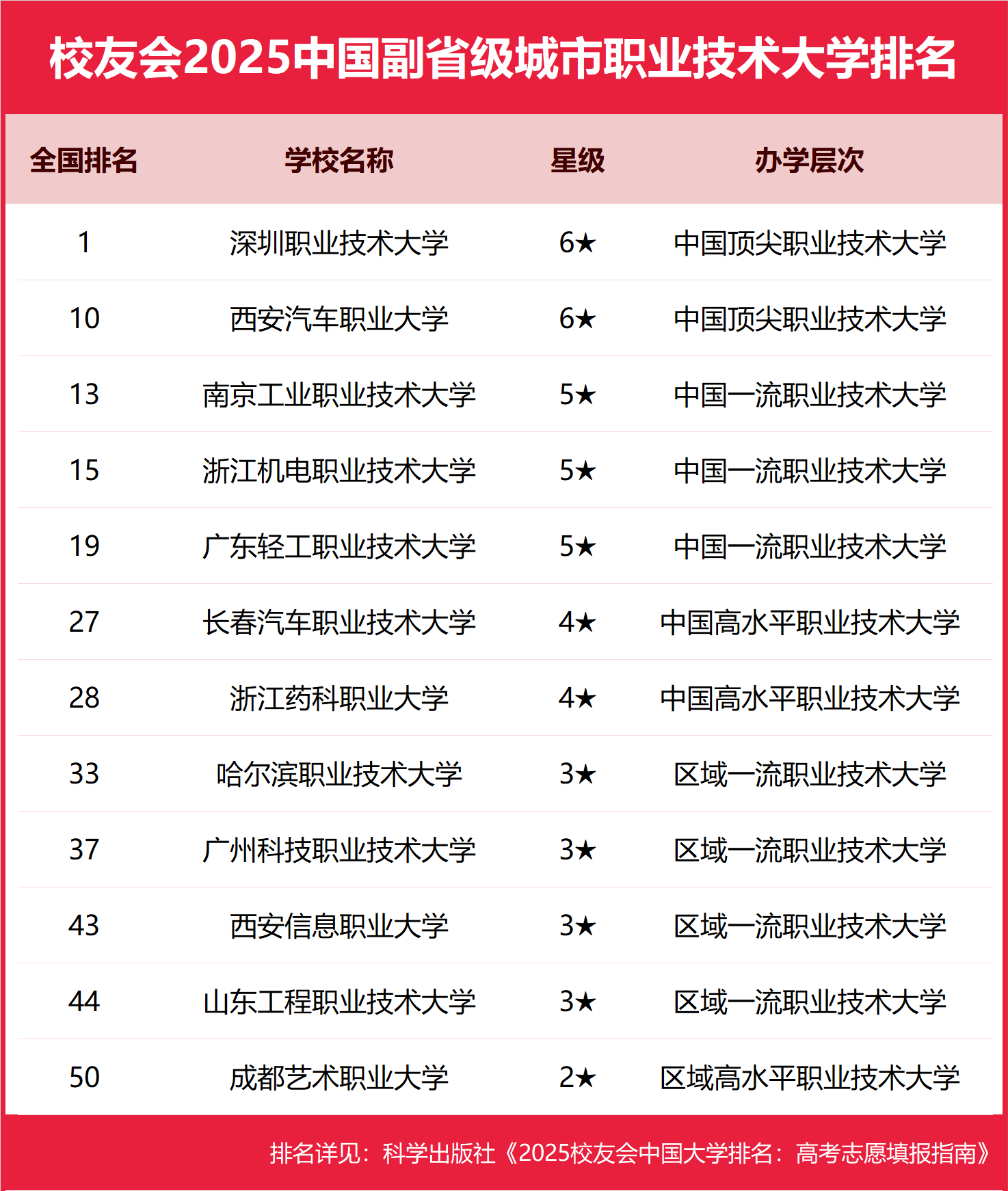 为了给2025年全国高考考生选择填报中国副省级城市高等院校提供权威参考,2025年1月6日,全国第三方大学评价机构艾瑞深校友会网(Cuaa.net)最新发布校友会2025中国副省级城市大学排名。 榜单显示,浙江大学位居2025中国副省级城市大学排名第一 ,武昌首义学院、西安欧亚学院、广州南方学院位居2025中国副省级城市民办大学排名第一 ,宁波诺丁汉大学位居2025中国副省级城市合作办学大学排名第一 ,深圳职业技术大学位居2025中国副省级城市职业技术大学排名第一 ,浙江金融职业学院位居2025中国副省级城市高职院校排名第一 。 北京大学连续19年夺冠,位居校友会2025中国大学排名榜首,清华大学第二,中国科学院大学第三,中国社会科学院大学跻身全国十强。 浙江大学、南京大学、华中科技大学勇夺2025中国副省级城市大学排名前三强。 武昌首义学院、三亚学院、西安欧亚学院和广州南方学院勇夺2025中国民办大学排名冠军。 广州南方学院、西安欧亚学院、武昌首义学院位列2025中国副省级城市民办大学排名前三强。 北京师范大学-香港浸会大学联合国际学院荣登2025中国合作办学大学排名第一。 宁波诺丁汉大学、香港中文大学(深圳)、深圳北理莫斯科大学位列2025中国副省级城市合作办学大学排名前三强。 芜湖职业技术学院、合肥职业技术学院和浙江金融职业学院勇夺2025中国高职院校排名榜首。 浙江金融职业学院、宁波职业技术学院、江苏经贸职业技术学院勇夺2025中国副省级城市高职院校排名前三强。 深圳职业技术大学、海南科技职业大学和河北科技工程职业技术大学名列2025中国职业技术大学排名前三强。 深圳职业技术大学、西安汽车职业大学、南京工业职业技术大学雄居2025中国副省级城市职业技术大学排名前三强。 四川大学锦江学院、电子科技大学成都学院、宁波大学科学技术学院、江苏大学京江学院、南京理工大学泰州科技学院雄居2025中国独立学院排名前五强。江西新能源科技职业学院、贵州工商职业学院、江西泰豪动漫职业学院、洛阳科技职业学院雄居2025中国民办高职院校排名前三甲。海南科技职业大学、西安汽车职业大学和广东工商职业技术大学雄居2025中国民办职业技术大学排名前三甲。 中国的副省级市共有广州、武汉、哈尔滨、沈阳、成都、南京、西安、长春、济南、杭州、大连、青岛、深圳、厦门和宁波等15个城市,副省级市的确定不仅有利于加快我国城市的经济与社会发展,而且有利于更好的发挥中心城市的辐射作用。 校友会中国大学排名首发于2003年,至今已有23年的历史,已成为具有广泛社会影响力、公信力、参考价值与创新力的中国大学排名领先品牌。 重磅:校友会2025中国大学排名详细评价指标体系 由艾瑞深研究团队独家编撰的《2025校友会中国大学排名:高考志愿填报指南》一书将由科学出版社公开出版发行。 浙江大学位居2025中国副省级城市大学排名第一,华中科技大学第三 在校友会2025中国大学排名中, 浙江大学综合办学实力最强、最具竞争力、办学水平最高,位居全国第5名,稳居2025中国副省级城市大学排名冠军。南京大学第二。华中科技大学第三。武汉大学第四。中山大学第五。哈尔滨工业大学第六。西安交通大学第七。山东大学第八。四川大学第九。厦门大学第十。 宁波诺丁汉大学位居2025中国副省级城市合作办学大学排名第一,深圳北理莫斯科大学第三 在校友会2025中国合作办学大学排名中, 宁波诺丁汉大学综合实力最强、办学水平最高、最具竞争力,位居全国第3名,位列2025中国副省级城市合作办学大学排名冠军。香港中文大学(深圳)第二。深圳北理莫斯科大学第三。香港科技大学(广州)第四。 武昌首义学院、西安欧亚学院、广州南方学院位居2025中国副省级城市民办大学排名第一 在校友会2025中国民办大学排名中,武昌首义学院、西安欧亚学院、广州南方学院综合实力最强、办学水平最高、最具竞争力,位居全国第1名,位居2025中国副省级城市民办大学排名冠军。文华学院第四。山东协和学院、西安培华学院、齐鲁理工学院第五。武汉工商学院第八。武汉城市学院、沈阳城市学院、长春财经学院第九。 深圳职业技术大学位居2025中国副省级城市职业技术大学排名第一,西安汽车职业大学第二 在校友会2025中国职业技术大学排名中, 深圳职业技术大学综合排名最高、办学水平最高,位居全国第1名,勇夺2025中国副省级城市职业技术大学排名榜首。西安汽车职业大学第二。南京工业职业技术大学第三。浙江机电职业技术大学第四。广东轻工职业技术大学第五。长春汽车职业技术大学第六。浙江药科职业大学第七。哈尔滨职业技术大学第八。广州科技职业技术大学第九。西安信息职业大学第十。 浙江金融职业学院位居2025中国副省级城市高职院校排名第一,武汉职业技术学院第四 在校友会2025中国高职院校排名中, 浙江金融职业学院办学水平最高,位居全国第1名,夺得2025中国副省级城市高职院校排名榜首。宁波职业技术学院第二。江苏经贸职业技术学院第三。武汉职业技术学院第四。南京信息职业技术学院、厦门海洋职业技术学院第五。广东科贸职业学院第七。深圳信息职业技术学院第八。四川交通职业技术学院、山东商业职业技术学院、广州番禺职业技术学院第九。 |